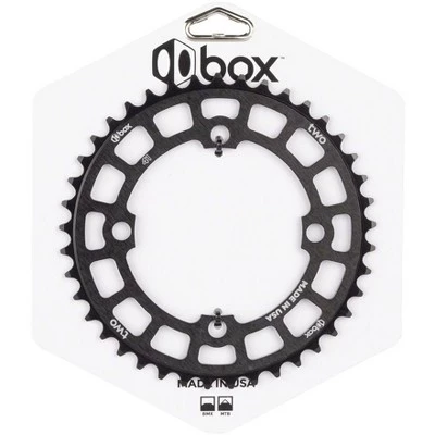 BOX Two chainrings are round and true. They fit 104 BCD four-bolt cranks and are feature a black anodized finish. Durable hard anodized finish. 3.5mm thickness. 90 grams / 3.17 ounces. Item Specifications: , MaterialAluminum, Tooth Count43, ColorBlack, Chainring BCD104,