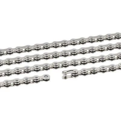 Connex R8 chains are great for all cases where the chain must resist extraordinary loads: on heavy-duty bikes, touring bikes, cargo bikes, or velo-taxis. The high-grade nickel coating protects the chain against corrosion, and the steel links provide for a long lasting durable chain.. For all hub gears with narrow cogs. 8.8mm pin width. Traditional master link with spring clip included. Alloy steel inner and outer links, both nickel-plated.