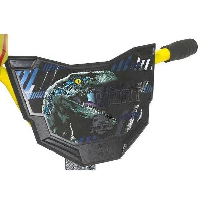 Our Jurassic World 16” bike is dino-mite for any elementary-aged raptor wrangler ready to ride into adventure. Inspired by Blue, the Jurassic World Velociraptor, this awesome bike features a sturdy steel frame construction with a high gloss bold blue splatter paint finish contrasted by a splash of yellow and vivid accents on both the frame and rims. The Jurassic World branded saddle is designed to ensure every new adventure is undertaken in creature comfort. And, to give this ride even more bite, the super bold handlebar shield has bold, authentic Jurassic World graphics and features our infamous Velociraptor in all his awesome glory! With an awesome and unique Dino-Grip that delivers an authentic raptor roar, your little one will be ready to ride and roar into new adventures and hours of outdoor fun.