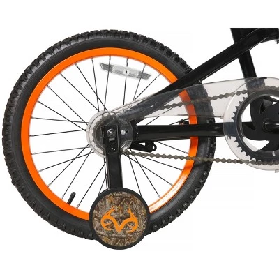 Your young rider will be ready to take on the outdoors on the Realtree 18” Bike. This distinctive ride has a sturdy steel frame with a deluxe paint finish. The Realtree camouflage is offset with bold hunter orange details on the frame, handlebar shield, training wheels, and the rims. A quick-release seat post makes size adjustments easy, allowing you to fit the rider as they grow. And, with a full cover chain guard, everything is kept clean, covered, and safe. The adjustable and removable training wheels will allow your young one to progress and grow at their own pace with as much or as little assistance as they need. Plus, with a solid rear coaster brake, they can stop with ease. The Realtree 18” bike is the tool your outdoor enthusiast needs on their next adventure.