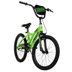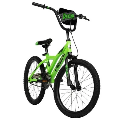 The Huffy Decay Bike has sleek neon green frame with black graphics for a great look! The front handlebar plaque and pad coordinate with the style.