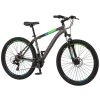 The Outlier 26-inch Dual Suspension Mountain Bike by Huffy will get your adrenaline pumping as you ride. This bike has the specs you need to explore the outdoors. The 21-speed twist shifting system with a Shimano rear indexed derailleur consistently shifts for quick adjustments when venturing uphill or accelerating on level ground. This one-of-a-kind bike features a front disc brake and a rear alloy linear pull brake that helps you ride with confidence. These brakes provide reliable stopping action in various weather conditions. They’re especially handy for climbs and descents, and for a more consistent response in muddy or rocky terrain. Dual suspension combines with a Shimano derailleur for the response you need. Wider tires increase momentum with less exertion, a characteristic you appreciate more, the further you ride. The front frame suspension is precision-crafted for a responsive ride, while the 3-piece steel crank remains durable for many years of use. The Outlier enlarged head-tube and alloy rims complement this stylish bike with added performance. The padded saddle is designed for comfort and style, plus the quick-release binder clip makes it easy to adjust as needed. The slight-rise handlebar encourages a more comfortable riding stance for increased confidence as you tackle trails. Get ready for exhilarating rides on this 26-inch mountain bike. Backed by a limited lifetime frame warranty. From Huffy. We make fun.