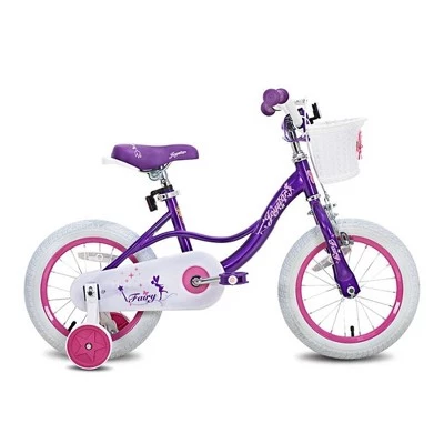 Kids can learn how to go from 4 wheels to 2 with the Joystar Fairy 12-Inch Kids Bike. This whimsical bike with removable training wheels gives little ones confidence and style, all they need to conquer the neighborhood sidewalks!Designed especially for kids and their safety, this bike has a quick-release seat that easily adjusts to your child’s height. When your little one is ready to try out 2 wheels, parents can grab onto the handle on the back of the seat to help support and guide their rider. The steel frame is tough and durable to survive the bumps of learning while the wide 12-inch tires provide extra stability for wobbly riders. While a handlebar brake is available, the rear coaster brake is much easier to use for smaller children.This purple bike comes with a DIY decal, allowing kids to customize their bike with their very own design! The white handlebar basket with a flower is the perfect way for kids to travel with all of their favorite treasures. Kids 2-4 years old or 32-41 inches tall will love learning with the Joystar Fairy 12 Inch Kids Bike.