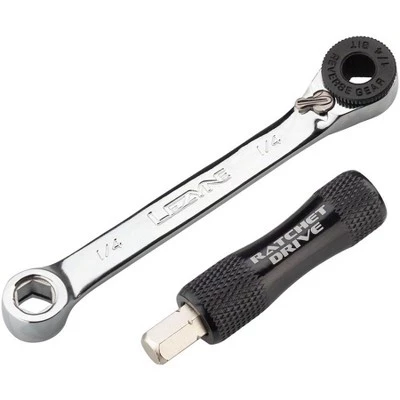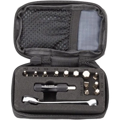 Durable and compact chrome plated ratchet tool designed for bicycles. Fine tooth ratchet with reversing lever and a fixed opening on opposite end. Tool selection optimized for road, gravel and mountain bikes. Super hard CRV (chrome vanadium) bits. Custom, machined aluminum extension adapter with laser etched logo. Integrated magnet holds tool bits in place. Ratchet Kit comes in a compact, soft shell carrying case.