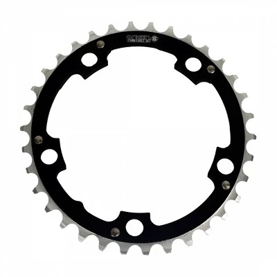 CHAINRING OR8 110mm 34T BK/SL CNC machined AL6061-T6 alloy construction. 8, 9, and 10 speed compatible. Available in ramped/pinned and standard styles. Black anodized finish with machined silver teeth. Made in the USA.