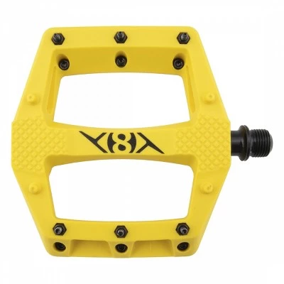 PEDALS OR8 STRAPD 9/16 YL Foot retention strap compatible design for single speed/fixed gear, as well as MTB or BMX riding. Pedal body made of ruggedly durable engineering grade thermoplastic. Sealed bearing and LSL sleeve bushing. 9/16` CNC chromoly spindle. 113mm x 114mm x 20mm concave platform. 8 fixed pins and 12 M3-9mm replaceable pins. 360g per pair.