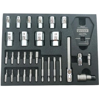Pedro’s Pro Bit and Socket Set is designed to work with our torque wrenches offering a full range of tools for the professional mechanic’s hex, torx, socket, and pedal needs. Extensive set is the perfect companion for your Pedro’s torque wrenches. Includes 17 hex and torx bits, 10 sockets, crowfoot pedal wrench, and 3 drive adapters stored in foam holder. Premium S2 tool steel bits, chrome vanadium sockets, and precision laser cut tool steel crowfoot ensure strength and lasting performance. Hex 2, 2.5, 3, 4, 5, 6, & 8mm (25mm), 4 & 5mm (50mm), 10mm (65mm, 3/8″ drive). Torx T10, T15, T20, T25, & T30 (25mm), T25 & T30 (50mm). Sockets 8,9,10,11,12,13mm (1/4″ drive), 14,15,17,19mm (3/8″ drive). Crowfoot 3/8″ Drive 15mm Pedal Wrench. Drive Adapters 1/4″ square to 1/4″ hex, 1/4″ hex to 1/4″ square, & 3/8″ square to 1/4″ hex.