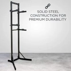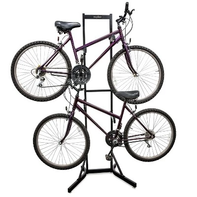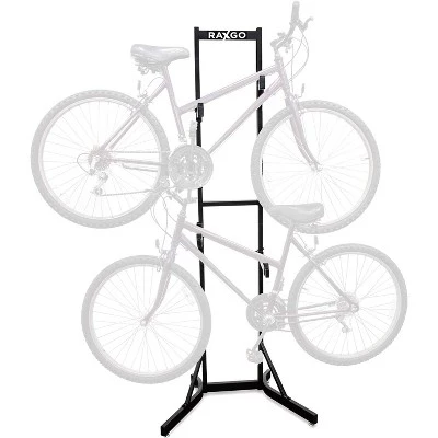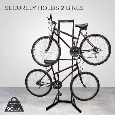 Whether you’re living in a small apartment or want to reclaim space in your garage, this Freestanding Bike Rack from RaxGo safely stores your ride without any permanent mounting or hanging required. Compatible with bikes of all shapes, sizes and functions, this vertical wonder features a durable powder-coated steel frame, adaptable arm supports, nonslip rubber cradles, sturdy adjustable legs, 2-bike load capacity and an ample 90-pound weight limit.To comfortably fit each bike’s frame onto the shelves, rotate the knobs, move the arms up or down, then lock into place. Assembly is also fast and simple. Just follow our handy diagrams, and you’re stacking in no time. From men’s mountain and commuter bikes to hard-to-mount women’s frames and children’s trikes, there’s nothing you can’t store! Take back your living space—add a RaxGo Freestanding Bike Rack to your cart today!