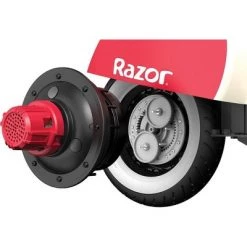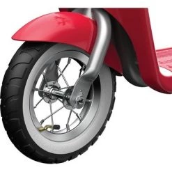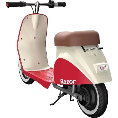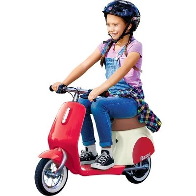Your kids are all about style, we know that. The Pocket Mod Petite is Razor’s smallest miniature Euro-style electric scooter designed for younger riders ages 7 and up. Razor’s Power Core 100-watt hub-driven motor delivers speeds up to 8 mph (13 km/h) and the 12V rechargeable battery provides up to 40 minutes of continuous ride time on a single charge. With the two-tone jewel box candy colored body, 10″ (255 mm) white wall pneumatic tires, color matching padded seat, twist-grip throttle control, and hand-operated brake, the ride on the vintage-inspired Pocket Mod Petite is as smooth as it is stylish.
