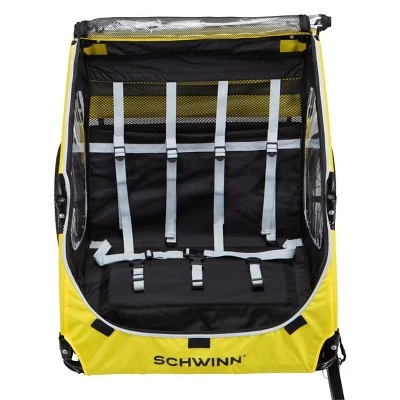 Make family outings even more fun with the Prescott two-passenger bike trailer by Schwinn. This bike trailer comfortably seats up to two child passengers in a reinforced seat structure with 3-point safety harness. Little ones can enjoy the scenery as you ride thanks to the panorama-view canopy with a 2-in-1 bug screen and weather shield to help protect them from the elements. Plus, the Prescott includes reflective window trim, making it easier for others to see you on low-light rides. When youβre done for the day, the collapsible frame and quick release wheels allow for compact storage and transport. Explore the neighborhood together with the Prescott two-passenger trailer. Enjoy the freedom of riding with Schwinn.