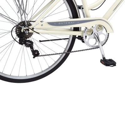 Like all Schwinn bikes the Gateway has limited lifetime warranty for as long as you own the bike. The Gateway is a bike of many talents. During the week it is a practical choice with 7 speeds, a rear carrier, alloy rims and brakes. Yet on weekends it has style and comfort with a spring seat, swept back handle bars, stylish paint and handsome fenders. Take a ride out for breakfast with friends or use it on a hilly campus. Classic style will take you where you want to go.