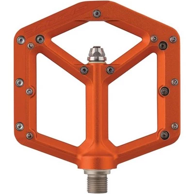 Spank Spike Pedals feature an aluminum body with a full-anodized finish with steel, replaceable pins for durability and traction. The axle is designed to not interfere with crank boots. Slim 12mm race and freeride pedal for maximized pedaling clearance. Forged alloy body is shot peened and anodized for increased durability. Equipped with hollow taper chromoly steel axles for strength. Sealed bearings and IGUS bushings. 20 preassembled pins in virtual concavity for ultimate grip. Recommended for: ASTM 5, All mountain, free ride, DH, E-Bike. Crank boot compatible axle.