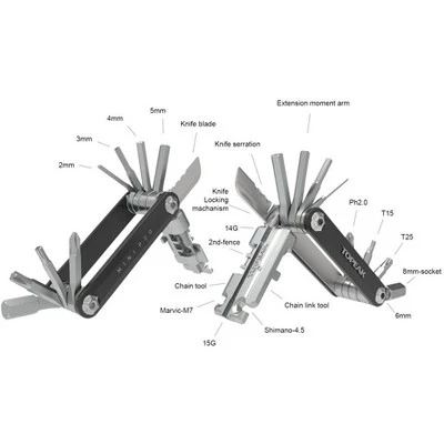 20 function pro-quality, precision mini tool with sleek forged alloy body. Integrated chain tool with built-in master link tool for removing master link type chains folds away for a streamlined profile. Compact forged alloy body. Perfect for any road or trailside repair. Integrated chain tool. Knife blade lock adds safety when using knife. Extend tools for extra leverage when repairing. Neoprene bag included. 2, 3, 4, 5, 6 mm Allen wrenches, 8 mm hex socket, T15, T25 Torx wrenches, 14G, 15G, Mavic M7, Shimano 4.5mm spoke wrenches, CrMo steel chain tool, CrMo master link tool #2 Phillips screw driver, serrated knife, saw. Material: forged aluminum body, chrome vanadium steel tools. The chain tool is not compatible with Campagnolo hollow pin chains. Item Specifications: , Number of Tools20, Chain ToolYes,