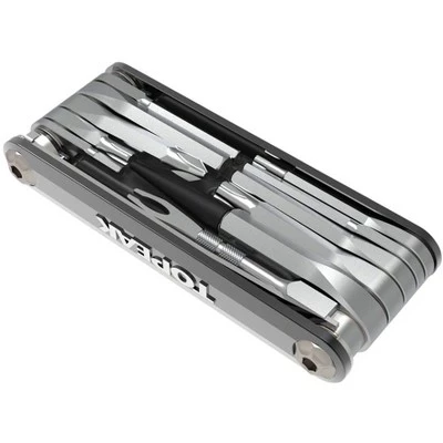 18 function, pro-quality, precision mini tool with integrated tubeless tire repair functions. Tubeless repair tools and tire repair plug compartment store inside the tool body for a streamlined profile. Perfect for any road or trailside repair. Integrated compartment for Tool Stop and 5 pieces of 3.5mm thick repair plugs. Detachable air-stop tool remains in tire to prevent tire pressure loss and makes it easy to insert tire repair plugs. Included tool stop helps keep the tire repair plug in place and eases plug tool removal. Included serrated knife helps trim excess tire repair plugs. Tool lock for knife blade and tire reamer / plug insertion tool add safety. 2, 2.5, 3, 4, 5, 6 mm Allen wrenches, T10, T25 Torx wrenches,, Stainless steel 2-in-1 tire reamer, plug insertion tool, Tool stop, serrated knife, saw, air-stop. Material: forged aluminum body, chrome vanadium steel tools. Item Specifications: , Number of Tools18, Chain ToolNo,