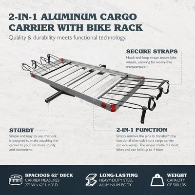 Add some extra storage space to your next road trip with the Tow Tuff TTF-2762ACBR Heavy Duty 2-in-1 Aluminum Cargo Carrier. The heavy duty cargo carrier has plenty of room to take care of all your various hauling needs. The unique design acts as a cargo carrier or as a bike rack by simply utilizing the installation pins included. The adjustable wheel holder and tie-down straps secure your bikes in place and holds up to 4 bikes at a time. The bike rack carrier has a total load capacity of 500 pounds and fits 2 inch receivers for easy mounting on your vehicle. Whether you’re going biking or hauling your things cross country, the Tow Tuff TTF-2762ACBR Heavy Duty 2-in-1 Aluminum Cargo Carrier has you covered.