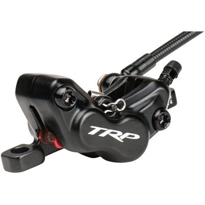 TRP Slate T4 hydraulic disc brakes are a 4 piston brake system offering excellent braking power in a lightweight package. Features an ergonomic, Aaron Gwin designed, alloy lever with dimpled accents made from cast aluminum. Forged and CNC’d, 4 piston caliper. Tool-free reach adjustment. Top loading caliper. Pads feature a resin compound that has increased thermal stability and shorter bed-in process.