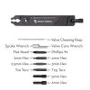 - 17 functions: spoke wrench; valve core wrench; flat head #3.5 and Phillips #2 screwdriver bits; 2, 2.5, 3, 4, 5, 6, and 8mm hex; and T10, T25 Torx-compatible bits; install and remove master links; clear tire sealant clogs from valve stem; tighten valve stem lock nut