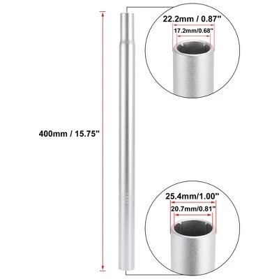 Easy to install. Made of aluminum alloy, Durable materials for long time service.Suitable for most of mountain bikes, road bike, MTB etc.There is a safe line mark on the seat post. Please insert at least above the minimum safety line.Specification:Material: Aluminum Alloy.Color: Silver Tone.Thickness: 2.5mm / 0.1″.Dimension: 400×25.4mm / 15.75″x1.00″(L*D).Hole 1 Size: 25.4×20.7mm / 1.00″x0.81″(OD*ID).Hole 2 Size: 22.2×17.2mm / 0.87″x0.68″(OD*ID).Note: The size measured by hand, so it may have a little 1-2 mm difference. Note: Please do measure the original outer diameter then choose the actual required diameter or measure the inner diameter of the frame tube before purchasing.Package Included:1 x Bicycle Seat Post.