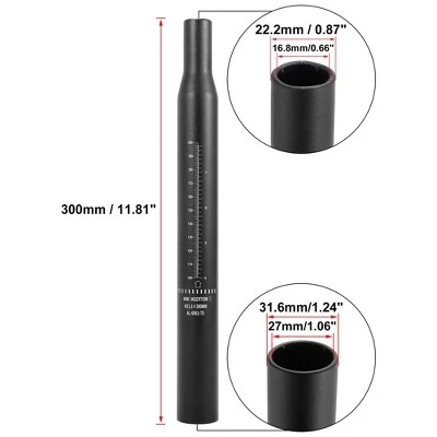Easy to install. Made of aluminum alloy, Durable materials for long time service.Suitable for most of mountain bikes, road bike, MTB etc.There is a safe line mark on the seat post. Please insert at least above the minimum safety line.Specification:Material: Aluminum Alloy.Color: Black.Thickness: 2.5mm / 0.1″.Dimension: 300×31.6mm / 11.81″x1.24″(L*D).Hole 1 Size: 31.6x27mm / 1.24″x1.06″(OD*ID).Hole 2 Size: 22.2×16.8mm / 0.87″x0.66″(OD*ID).Note: The size measured by hand, so it may have a little 1-2 mm difference. Note: Please do measure the original outer diameter then choose the actual required diameter or measure the inner diameter of the frame tube before purchasing.Package Included:1 x Bicycle Seat Post.