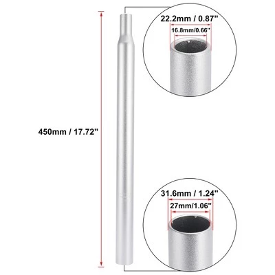 Easy to install. Made of aluminum alloy, Durable materials for long time service.Suitable for most of mountain bikes, road bike, MTB etc.There is a safe line mark on the seat post. Please insert at least above the minimum safety line.Specification:Material: Aluminum Alloy.Color: Silver Tone.Thickness: 2.5mm / 0.1″.Dimension: 450×31.6mm / 17.72″x1.24″(L*D).Hole 1 Size: 31.6x27mm / 1.24″x1.06″(OD*ID).Hole 2 Size: 22.2×16.8mm / 0.87″x0.66″(OD*ID).Note: The size measured by hand, so it may have a little 1-2 mm difference. Note: Please do measure the original outer diameter then choose the actual required diameter or measure the inner diameter of the frame tube before purchasing.Package Included:1 x Bicycle Seat Post.