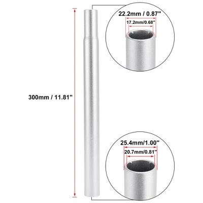 Easy to install. Made of aluminum alloy, Durable materials for long time service.Suitable for most of mountain bikes, road bike, MTB etc.There is a safe line mark on the seat post. Please insert at least above the minimum safety line.Specification:Material: Aluminum Alloy.Color: Silver Tone.Thickness: 2.5mm / 0.1″.Dimension: 300×25.4mm / 11.81″x1.00″(L*D).Hole 1 Size: 25.4×20.7mm / 1.00″x0.81″(OD*ID).Hole 2 Size: 22.2×17.2mm / 0.87″x0.68″(OD*ID).Note: The size measured by hand, so it may have a little 1-2 mm difference. Note: Please do measure the original outer diameter then choose the actual required diameter or measure the inner diameter of the frame tube before purchasing.Package Included:1 x Bicycle Seat Post.