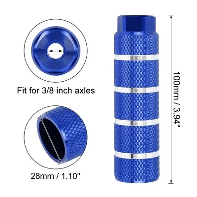 Pair Aluminum Alloy Stripe Cylinder Axle Rear Foot Pegs Footrests for Bike Bicycle Fit 3/8 Inch Inner Dia Blue.Description:Made of aluminum alloy material, easy installation, durable and stylish.Universal fit for bike, road bike, mountain bikes, track bike, MTB, BMX.Align 3/8 inch axle and tighten by hand or tool directly, no extra operation required.Specification:Color: Blue;Material: Aluminum Alloy;Size: 100x28mm / 3.94″x1.10″(H*D);Fit for Axle Diameter: 3/8 inch (9.5mm).Note:Avoid standing on your feet during cycling, reducing danger.Package include:1 Pair x Bike Foot Pegs
